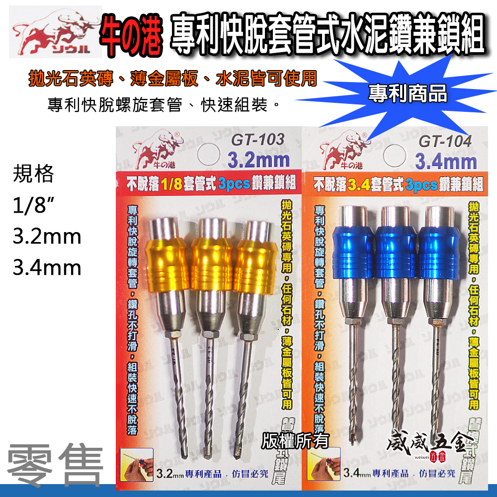 鬥牛|3.2mm 3.4mm 專利快脫旋轉套管式鑽兼鎖 鎖牙萬用水泥鑽頭 3支組|GT-103 GT-104