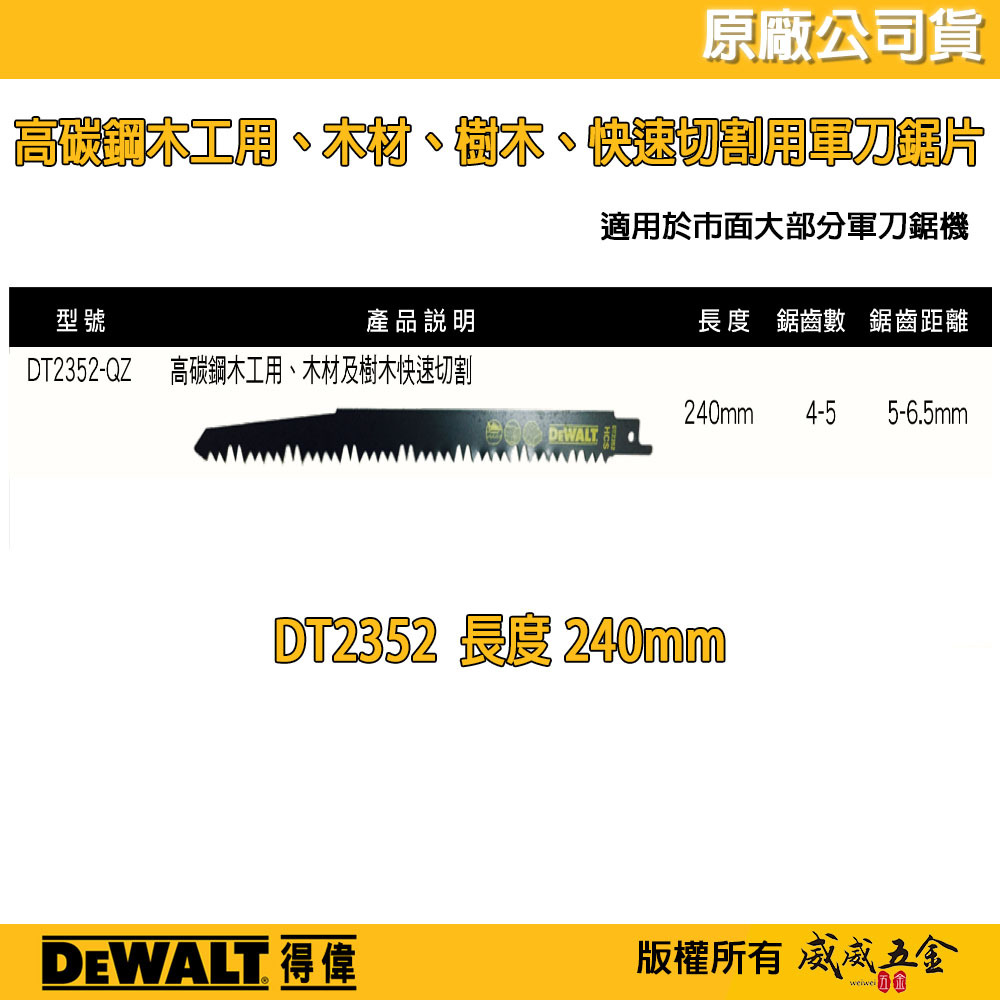 DEWALT 美國 得偉|長240mm 木工木材用切割片 樹木切割用軍刀鋸切片 軍刀鋸片|DT2352|單片